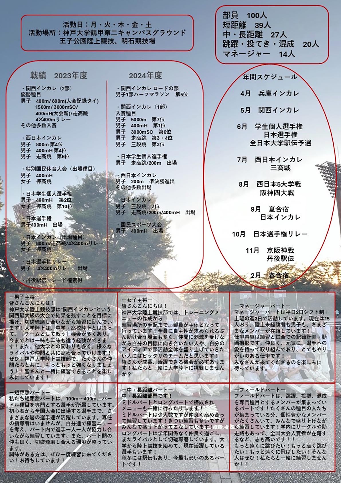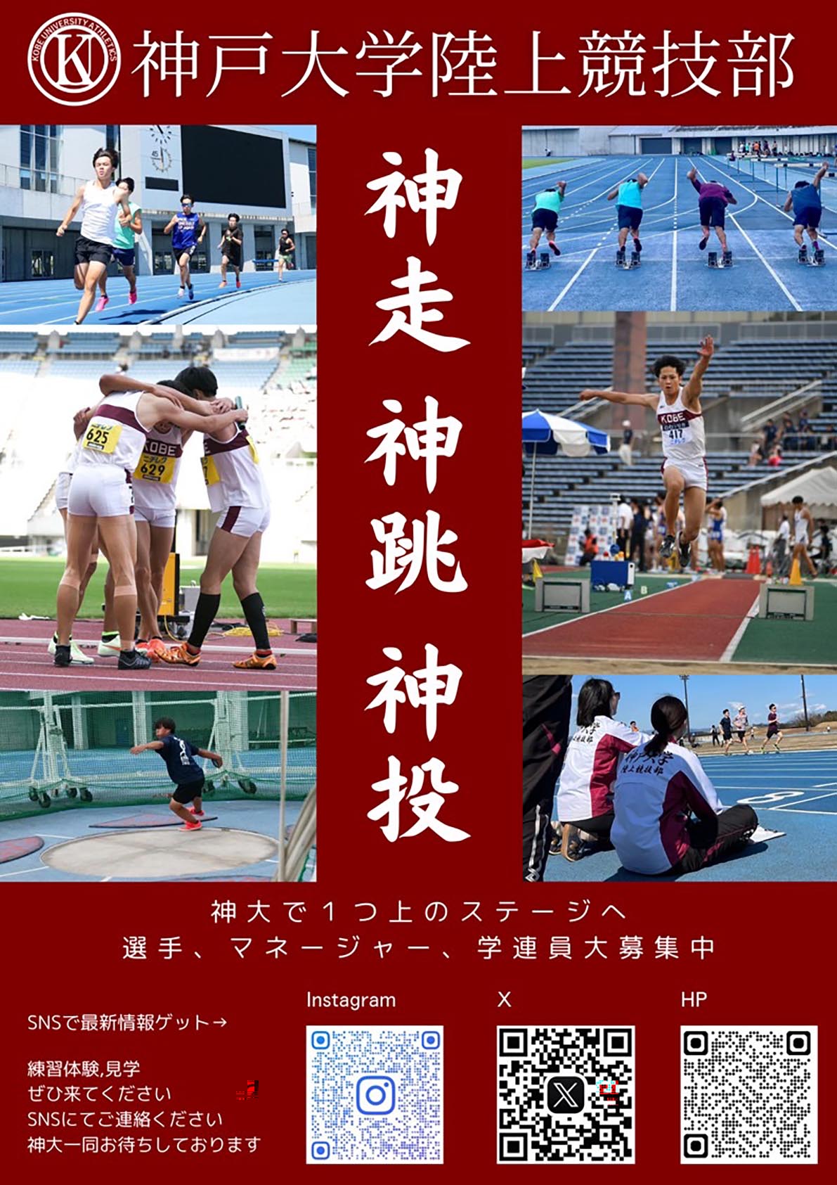 0.01秒、1cmでも限界を超えるために日々練習を積み重ねています!マネージャー、学連員も募集中です!関西インカレをはじめ、対校戦に出場する人、支える人、応援する人全員で一つとなり目標達成、優勝を目指します。部員全員仲が良く励まし合いながら共に成長しています!