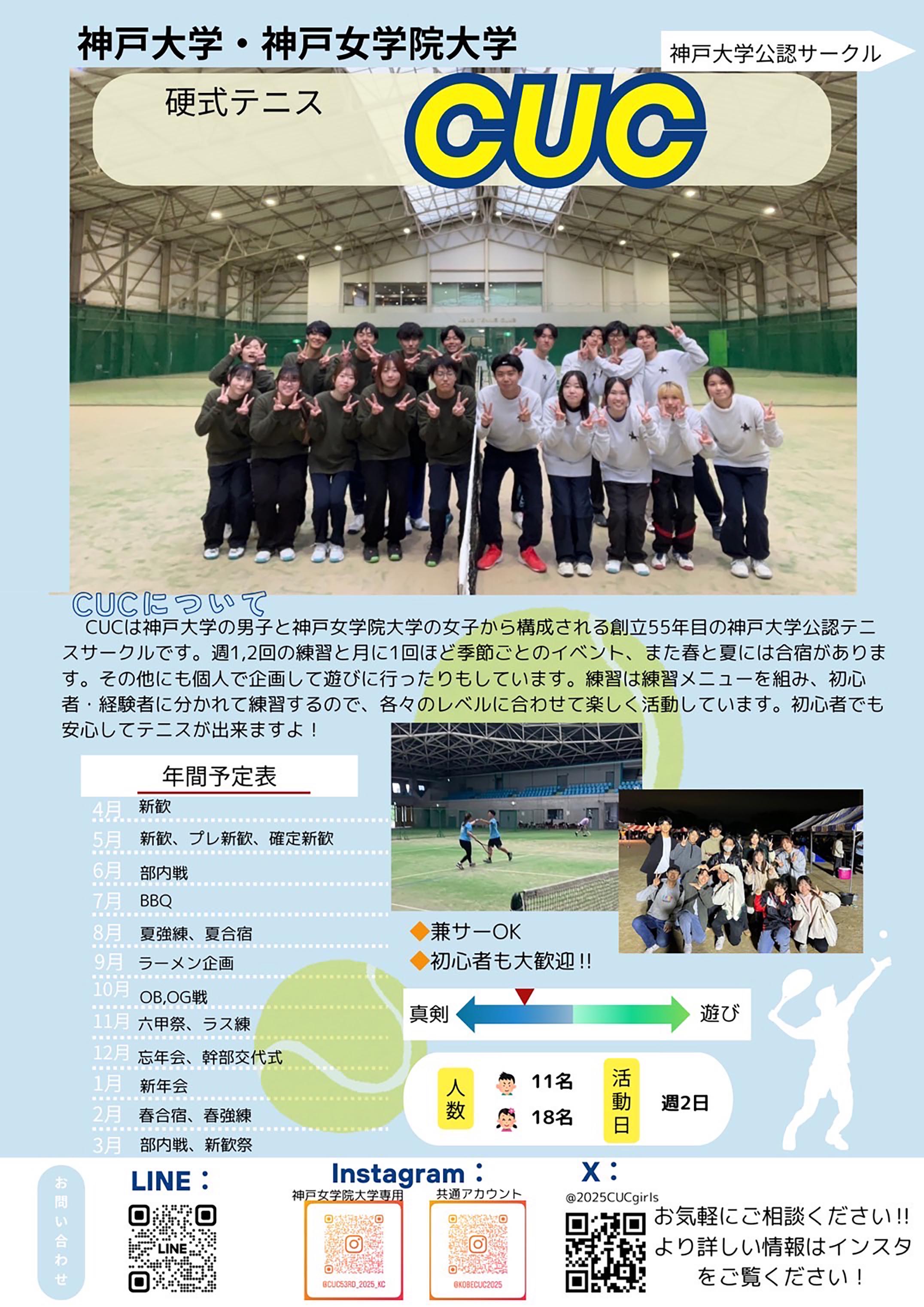 CUCは男子は神戸大生、女子は神戸女学院生から成るテニスサークルです。週1.2回の練習と月に1回ほど季節ごとのイベントがあります。春と夏には合宿があります。練習は練習メニューを組み、初心者経験者分かれて練習するので、各々のレベルに合わせて楽しめます!イベントは絶対参加になっているものもあり、サークル全員と仲良くなれます!少しでも興味を持ってくれた方は、ぜひ1度新歓に来てみて下さい!