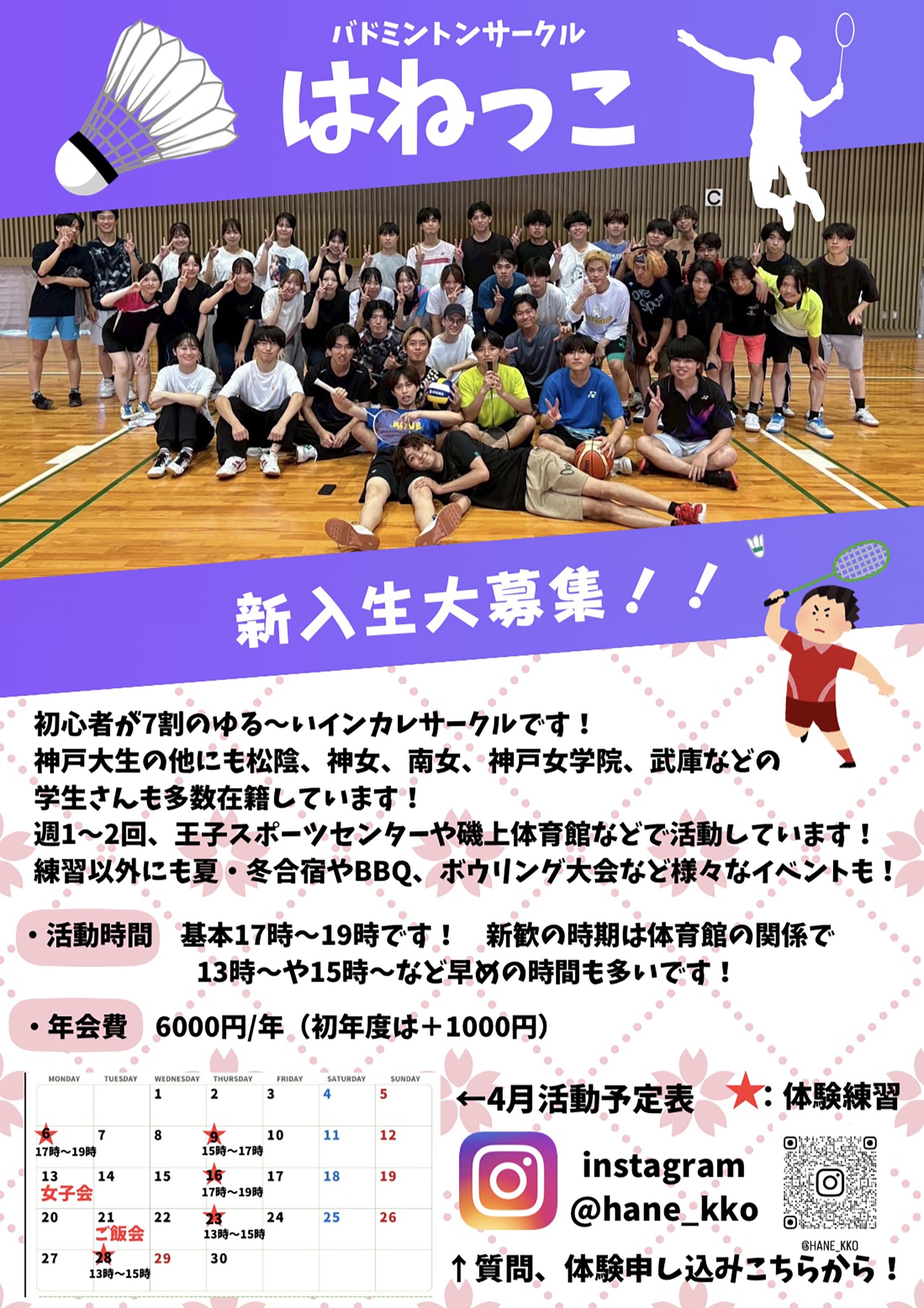 王子スポーツセンターや磯上体育館で学校終わりの時間にバドミントンをして楽しく活動しています!初心者・経験者どちらも大歓迎です!バドミントン以外にも毎月楽しめるイベントを開催してます!