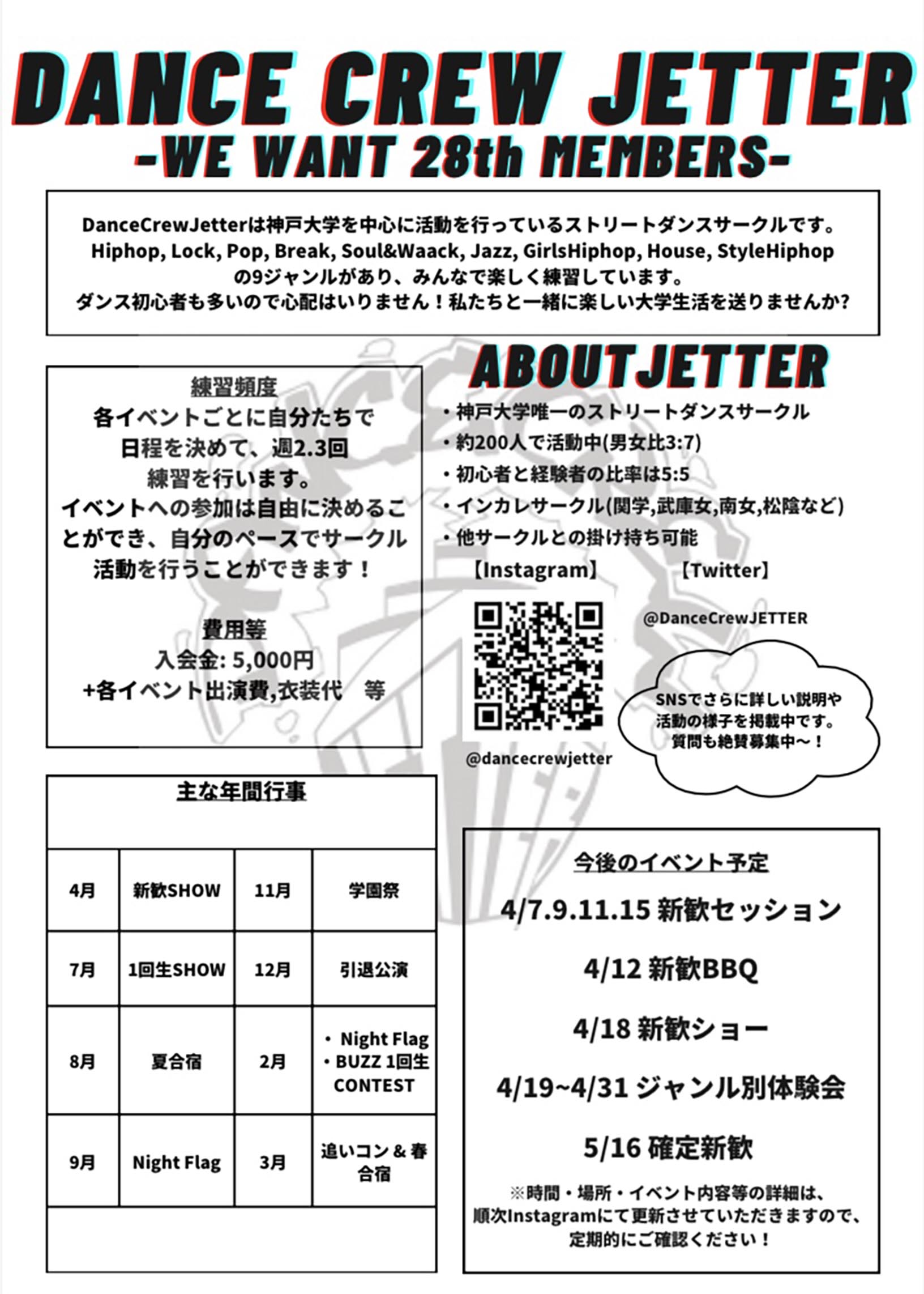 我々ジェッターは三宮のみなとの森公園をメインの活動場所とし、初心者から経験者まで、イベント前に週に2、3回ほど活動しています!9つほどのジャンルに分かれており、ショーケース、バトル、セッションなど幅広い楽しみ方ができます!!
