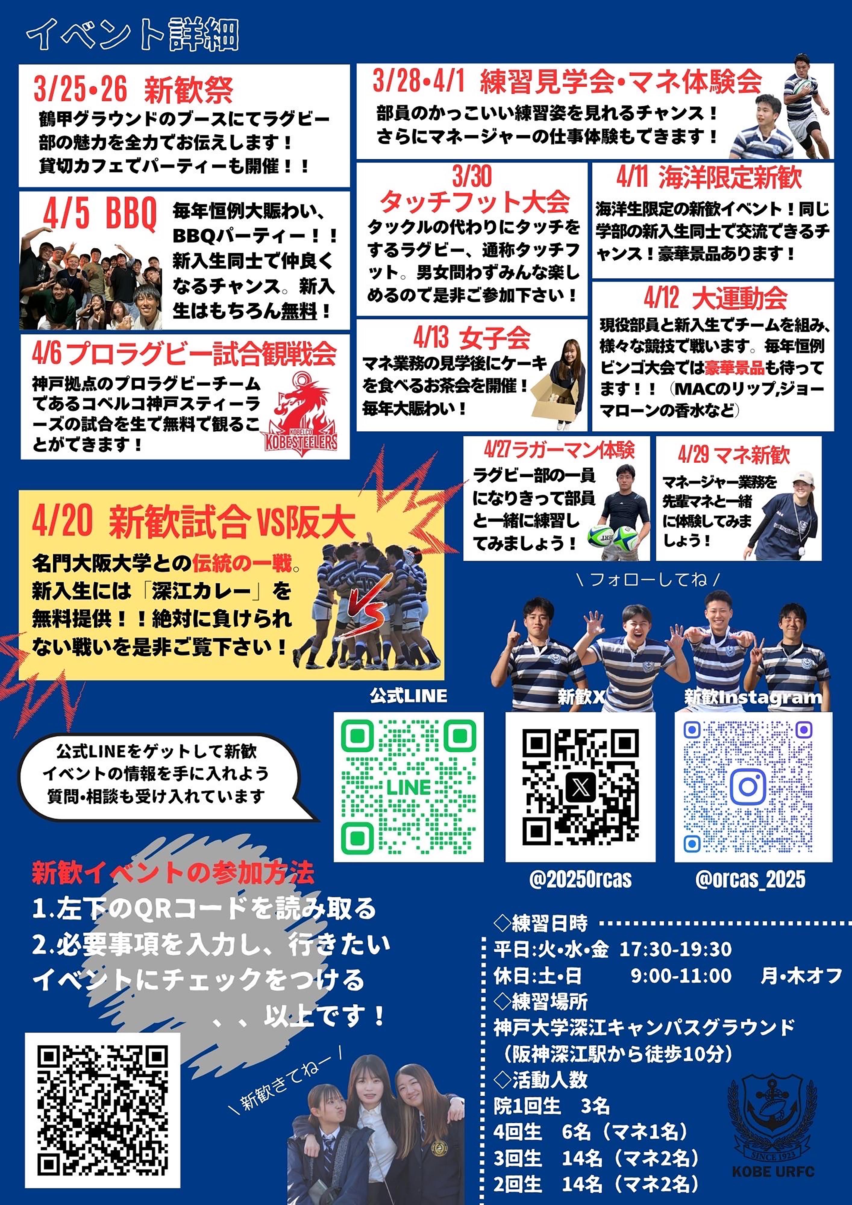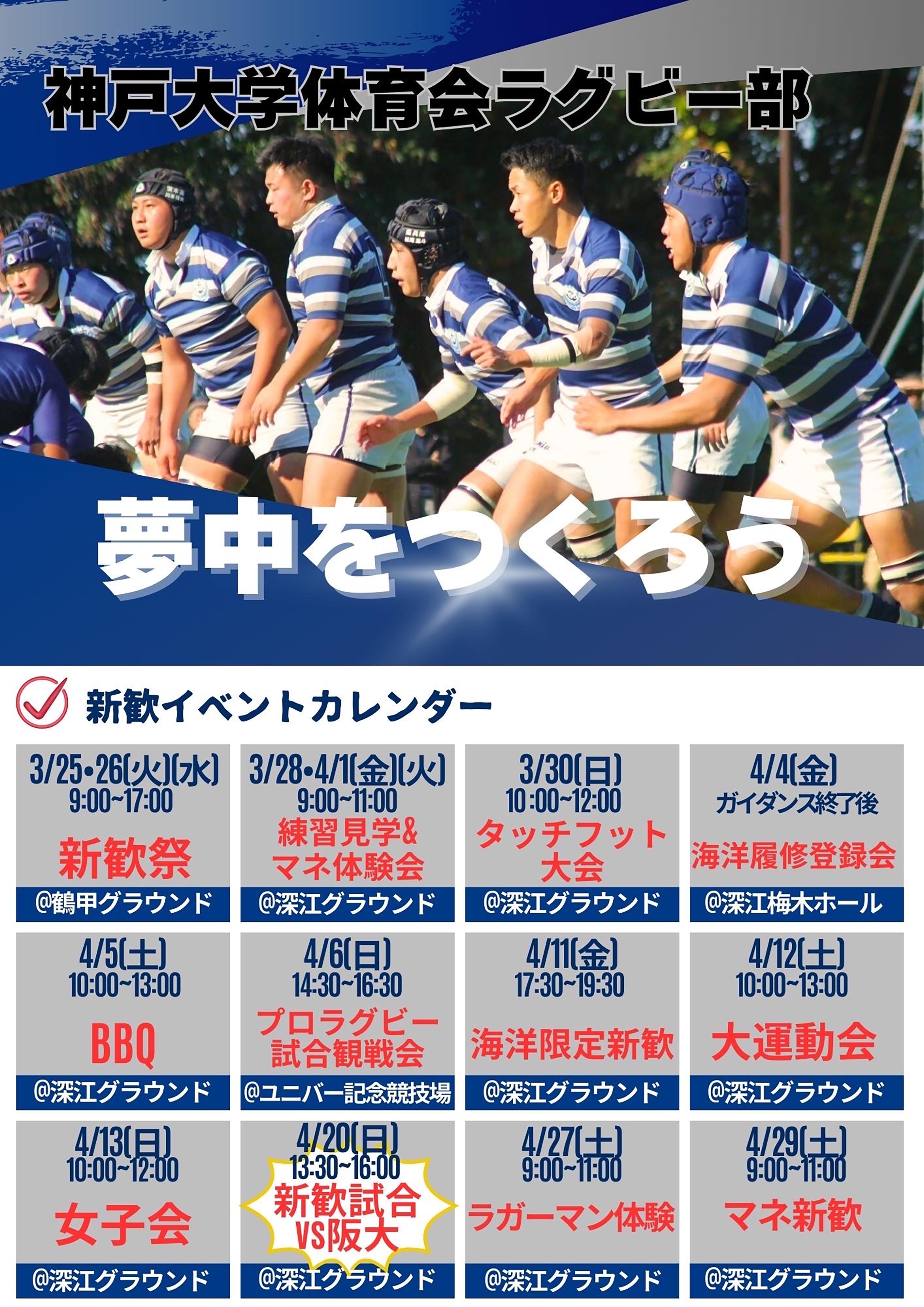 ラグビーはとっても面白いスポーツです。大学から始めた人や、2回生から始めた人もいます。チームメイトも面白い人ばかりです。神大ラグビー部の魅力はここでは語りきれないので、新歓・見学でお待ちしております!