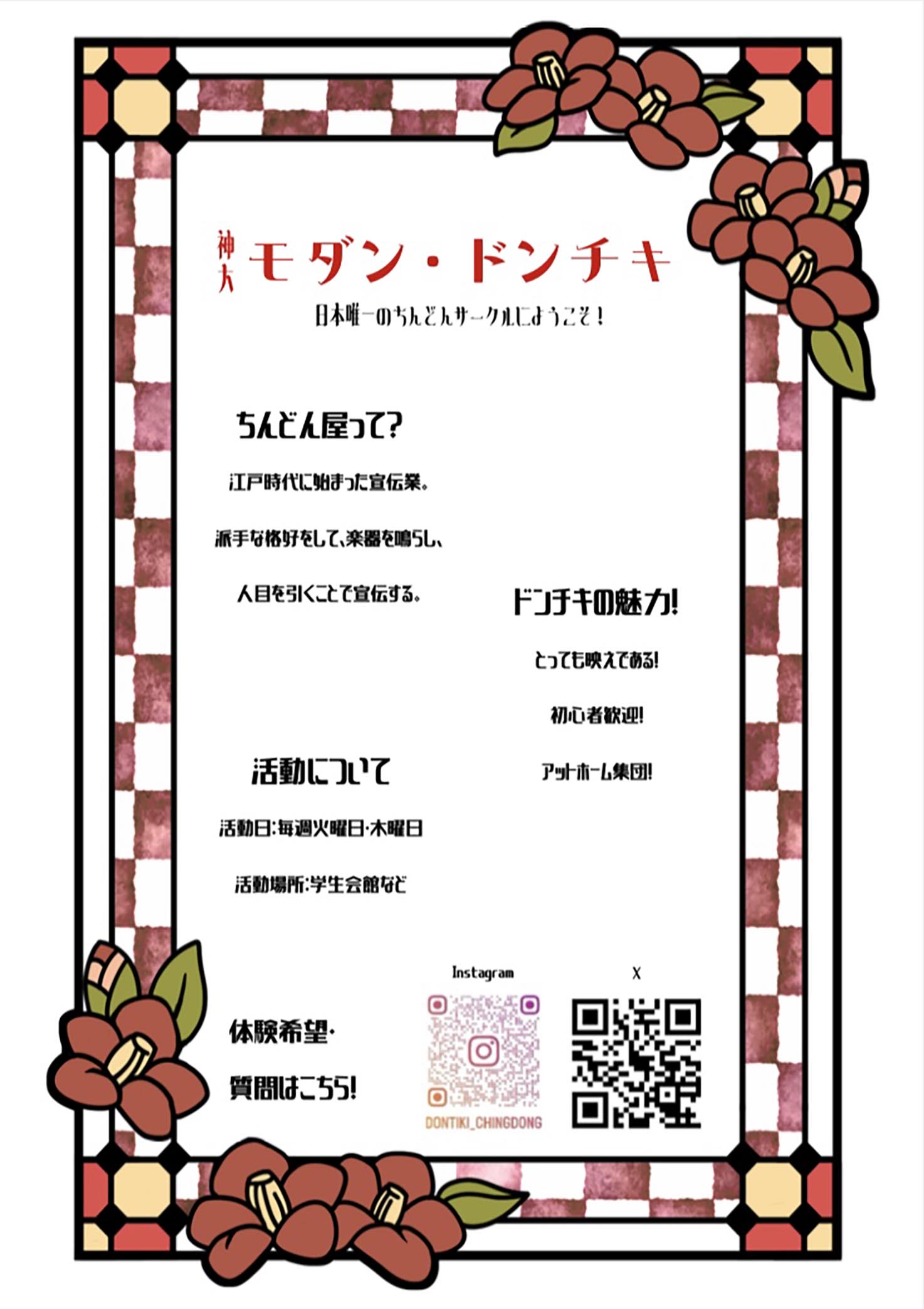 日本で唯一のちんどん屋サークルです!地域のお祭りなどに参加して、普段はできない派手な化粧や、着物などの衣装を着て、演奏しています。ドンチキで、私達と一緒に他ではできないユニークな体験をしてみませんか?