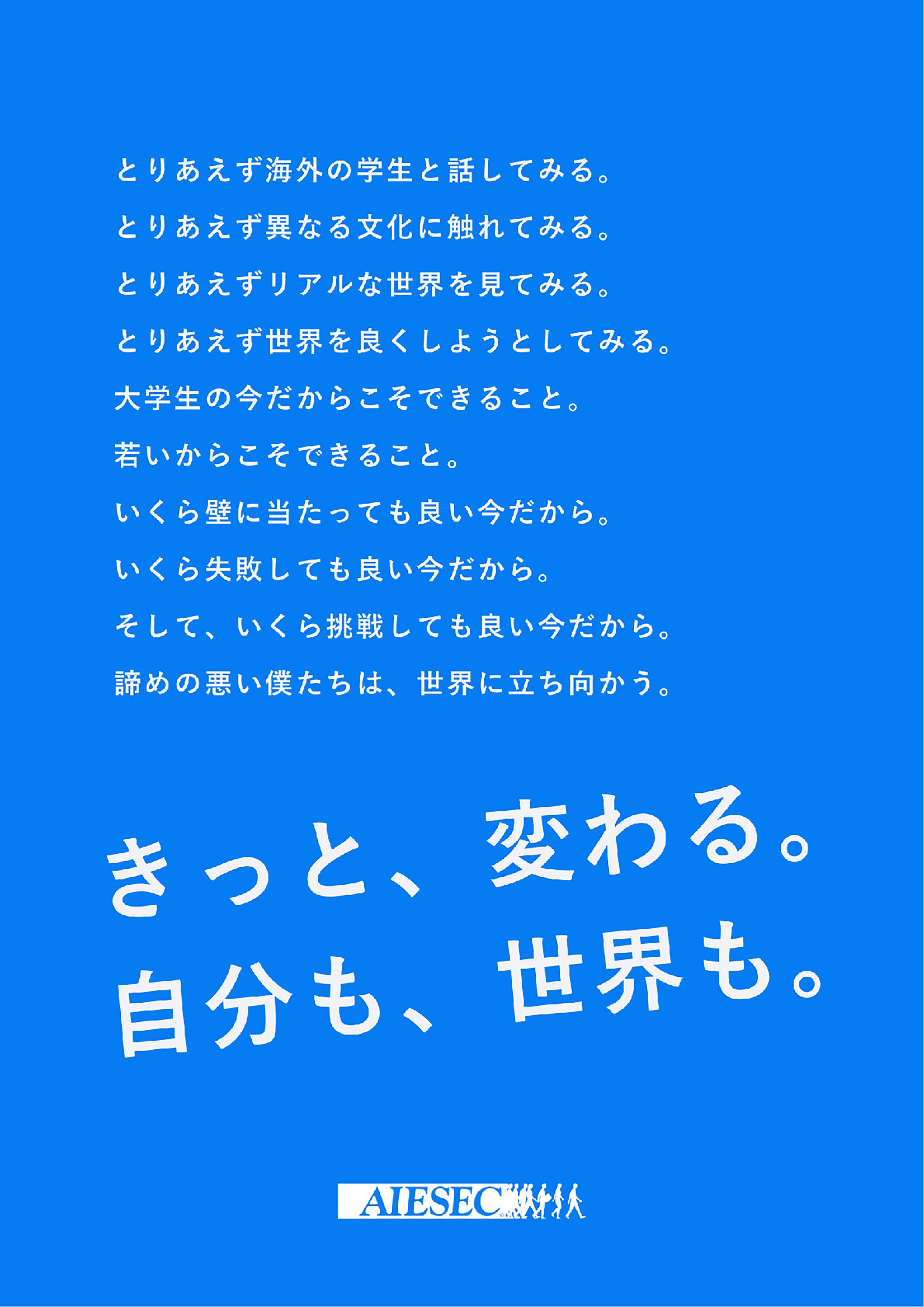 アイセックは世界100以上の国と地域に展開する世界最大級の学生NPO団体です。私たちは海外研修プログラムの運営事業を通じ、若者のリーダーシップを育んでいます。「学生生活で何かに熱中したい」そんな思いを持つ仲間と共に、国境を越えた事業運営に挑戦しませんか?熱量の高い同世代と切磋琢磨し、社会へ価値を届ける。ここでしか味わえない、代えがたい成長体験があなたを待っています!