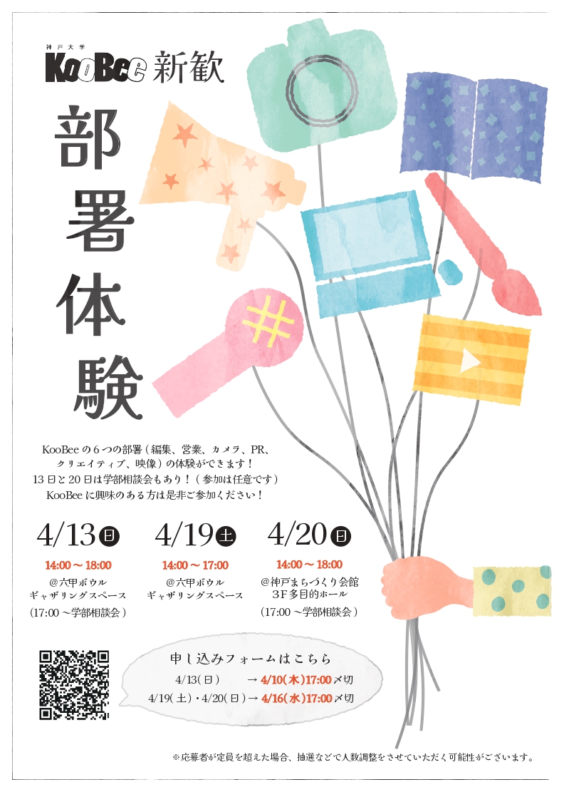 神大生の素敵なキャンパスライフをお手伝いするために、冊子「KooBee」の発行やWebサイト「WeeBee」の運営、SNSによる様々な情報発信などをしています。6つの部署に分かれて活動しており、どの部署でもKooBeeでしかできない体験がいっぱいです!
