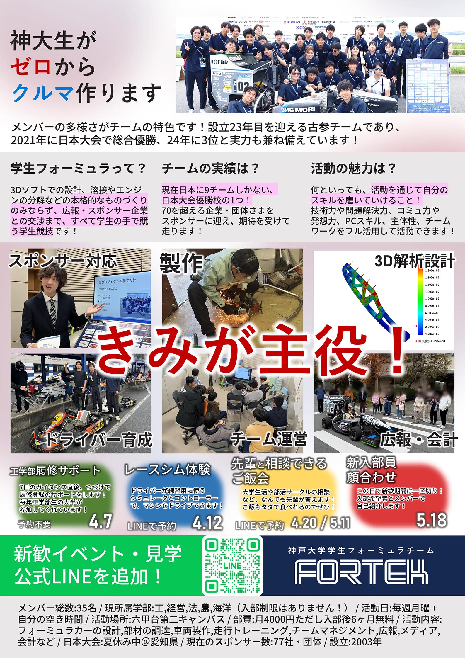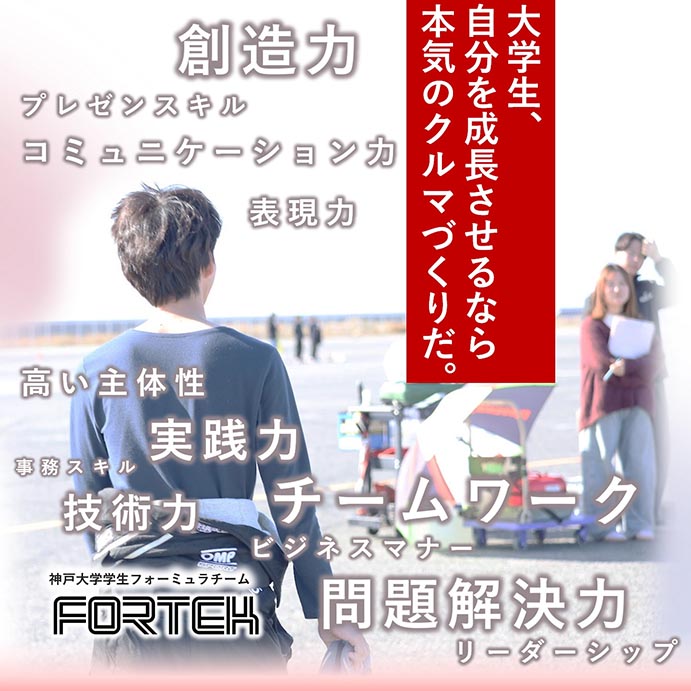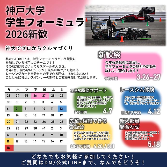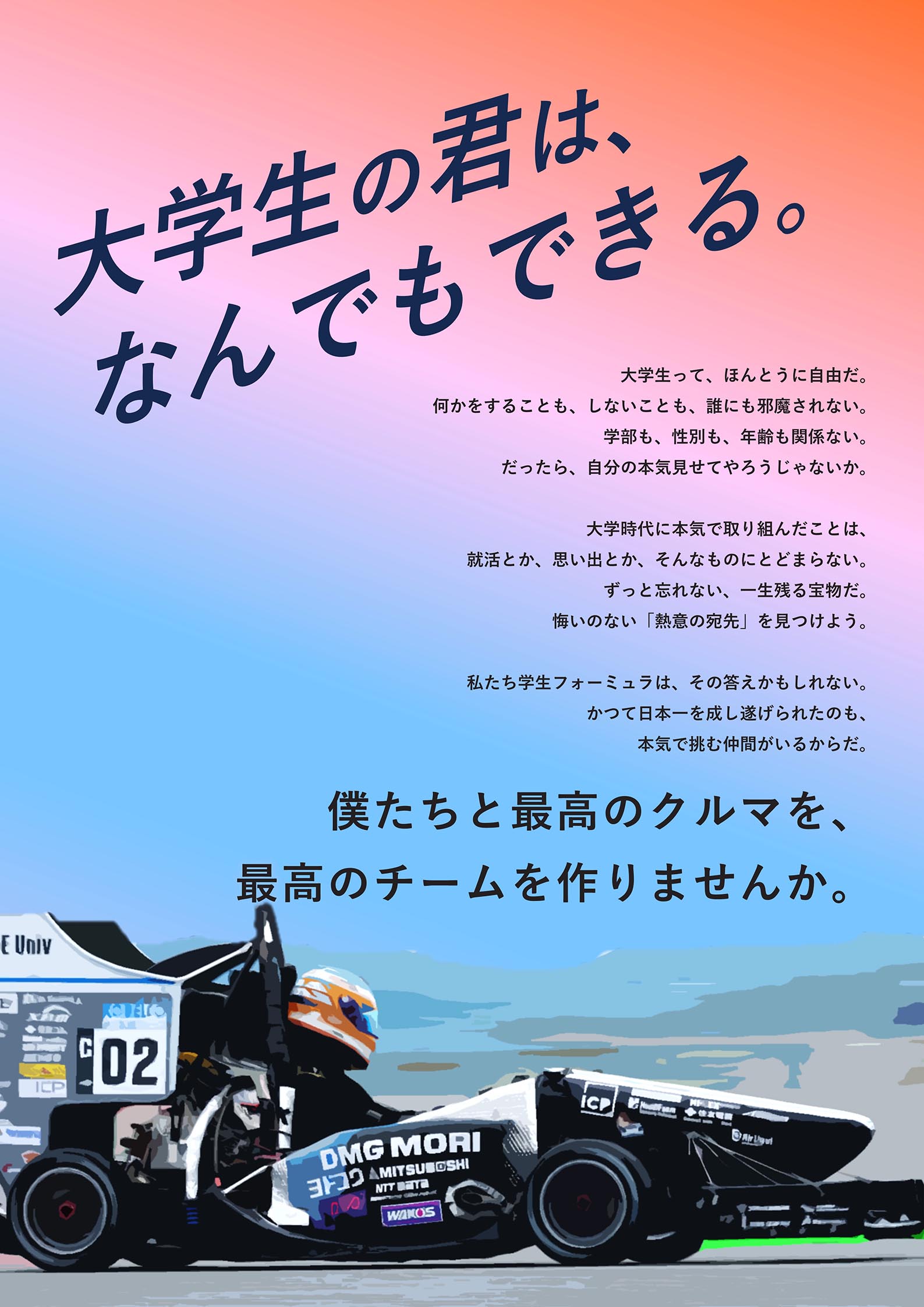 私たちは学生だけでレーシングカーの設計・製作・走行の全てを行っています!8月に愛知県で開催される大会では、単純な速さだけでなく性能やコスト、プレゼンまで競われ、まさにものづくりの総合格闘技です!スポンサー企業との交渉も学生自身で行うなど、幅広く活動しています!車が好きな人だけでなく、ものづくりが好きな人など文理・男女問わず部員募集中です!車に関する知識がなくても、優しい先輩方がなんでも教えてくれる