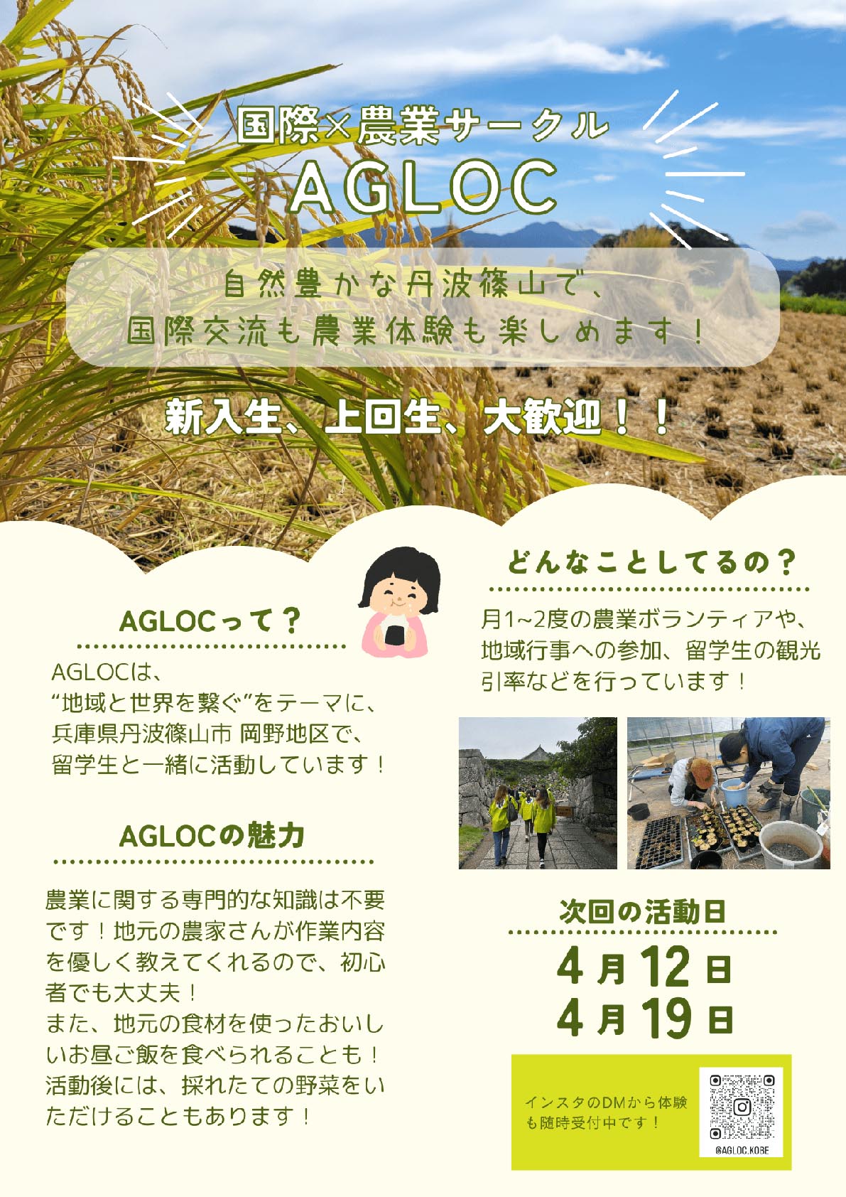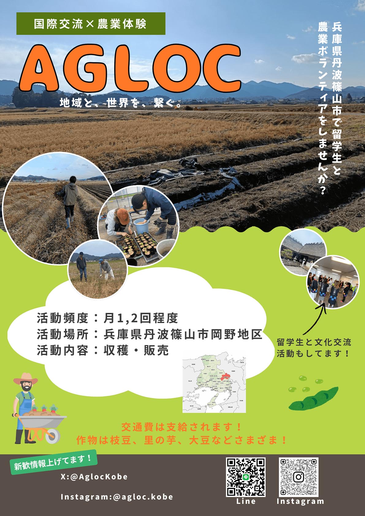 我々AGLOCは“地域と世界を繋ぐ”をテーマに、兵庫県丹波篠山市岡野地区で活動する学生団体です。 学部、学年、国籍も様々なメンバーが参加しています。月1~2度の農業ボランティアや、地域行事への参加、留学生の観光引率などを行っています!