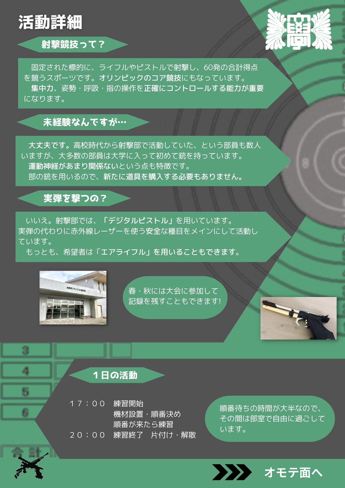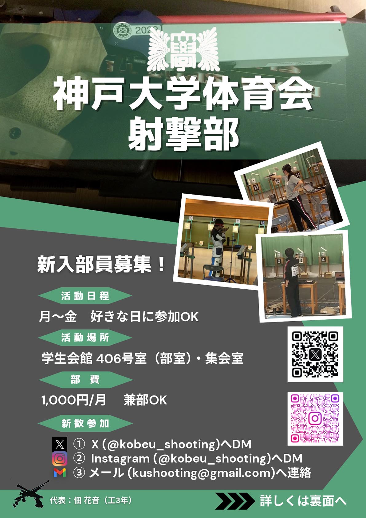 射撃部では、ほとんどの部員が大学入学後に競技を始めています。 中には、初心者から競技を始め、関西大会でベスト8に入賞した部員もいます! 射撃競技は、運動神経や体力に大きく左右されない点が特徴です。また、部の銃を使用するため、自分で銃を購入する必要もありません。 毎回の練習は自由参加なので、学業、アルバイトと両立しながら、自分のペースで活動できます。兼サーもOKです! お気軽に体験会にお越しください