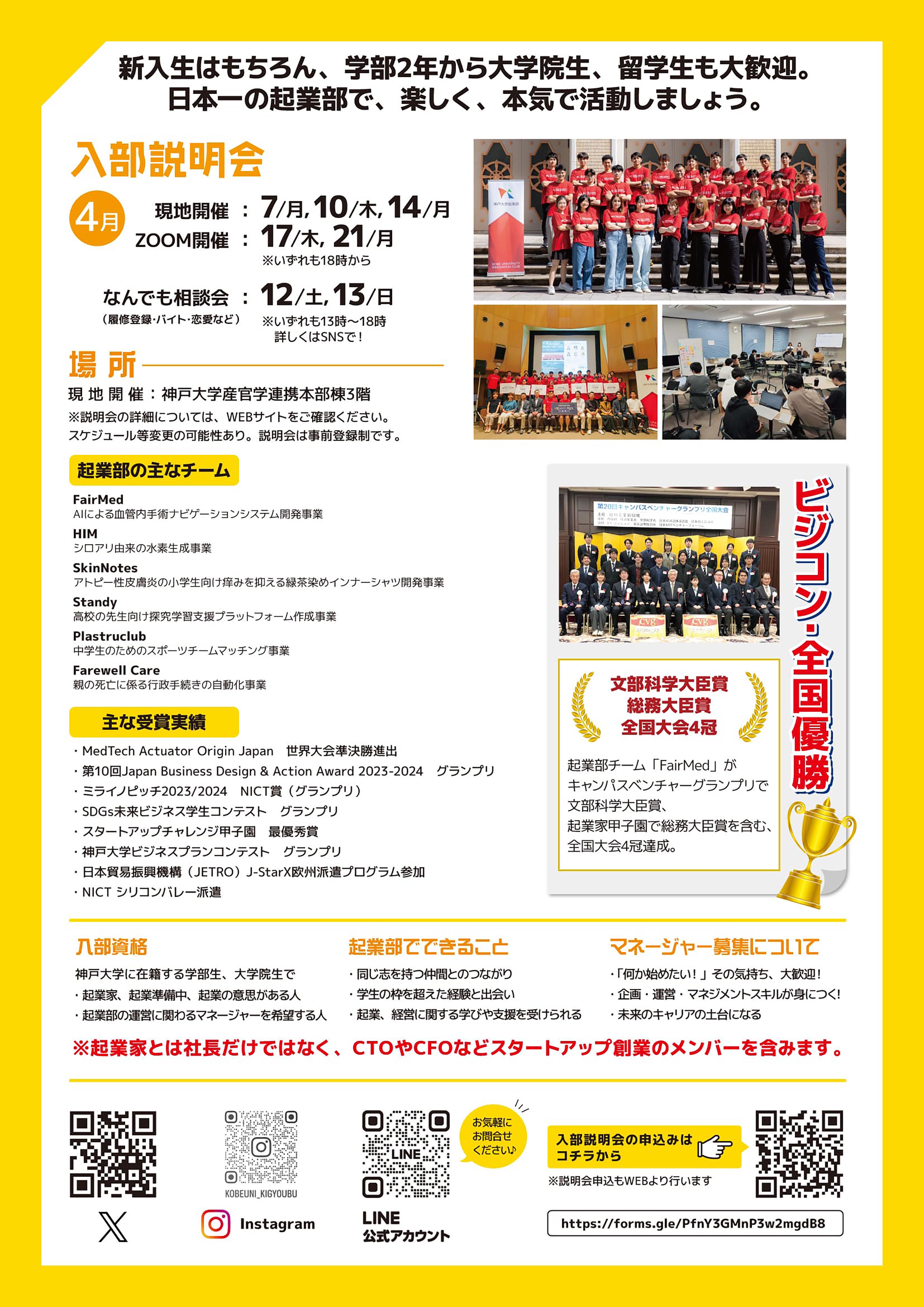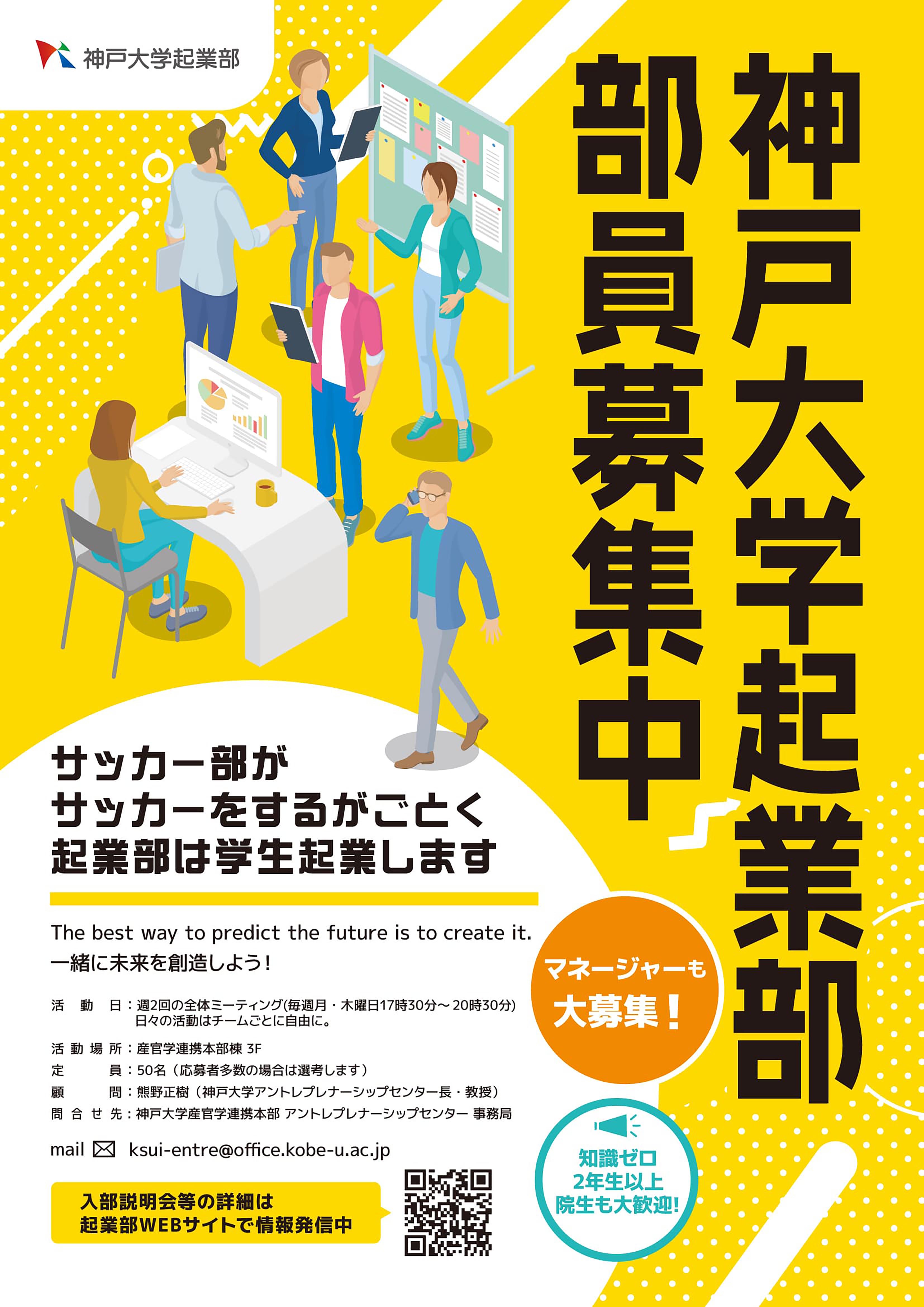 神戸大学公認、本気で起業したい学生が集まる団体です。週2回の全体活動の他、ビジネスコンテストに向けたチーム活動を行っています。豊富なサポートのもと、学年(新入生~社会人博士)・学部も様々な仲間と起業を目指しませんか?共に部を創り上げるマネージャーも募集中です!