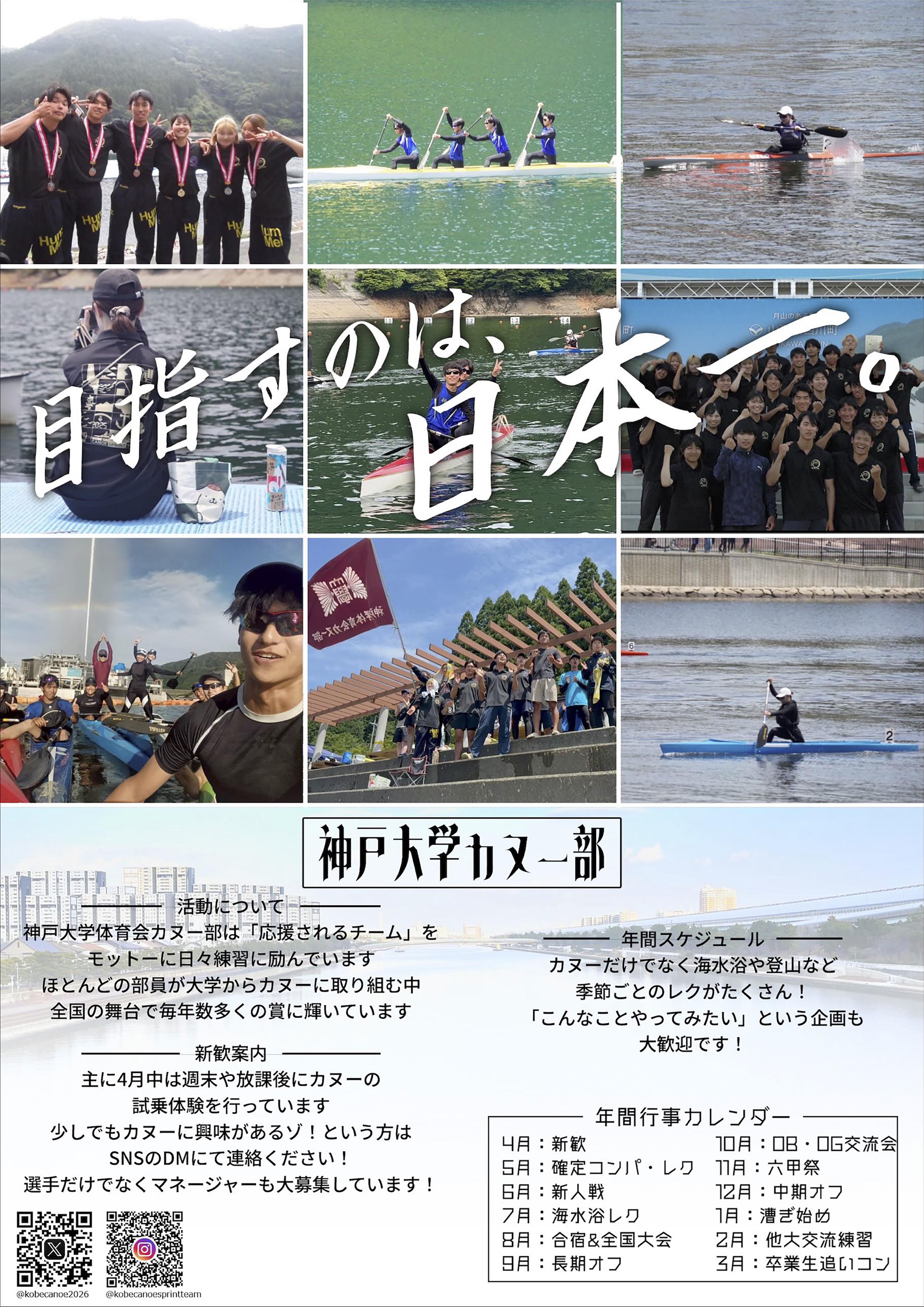 9割以上の人が初心者ですが、夏のカンカレ・インカレで最高の結果が残せるよう、日々頑張っています!マネージャーは練習中の選手をビデオに収めたり、練習後におにぎりを作ったりと選手のサポートをしています!練習は真剣そのものですが、オフでは皆でたくさん遊びます!!熱い青春を過ごすならカヌー部です!