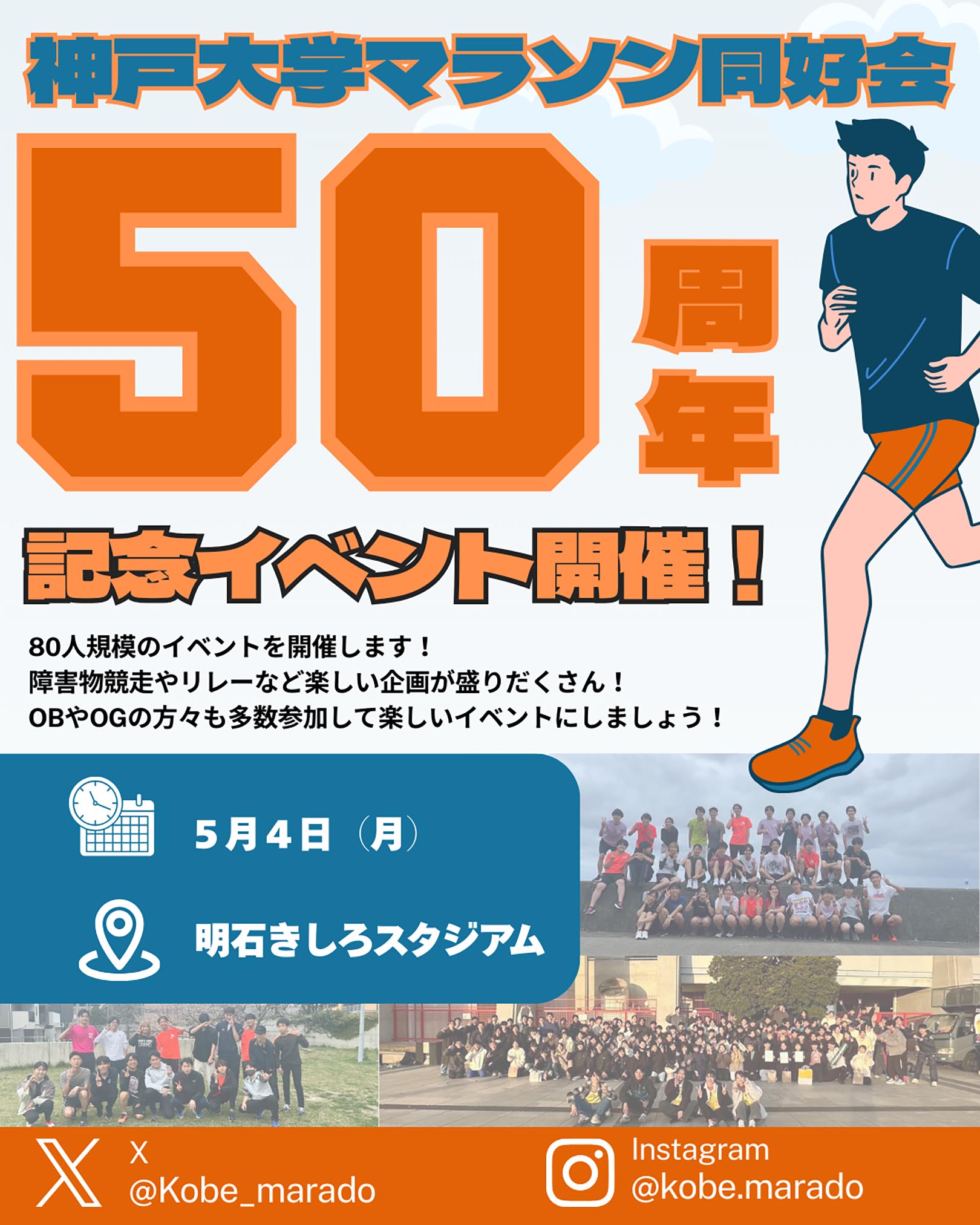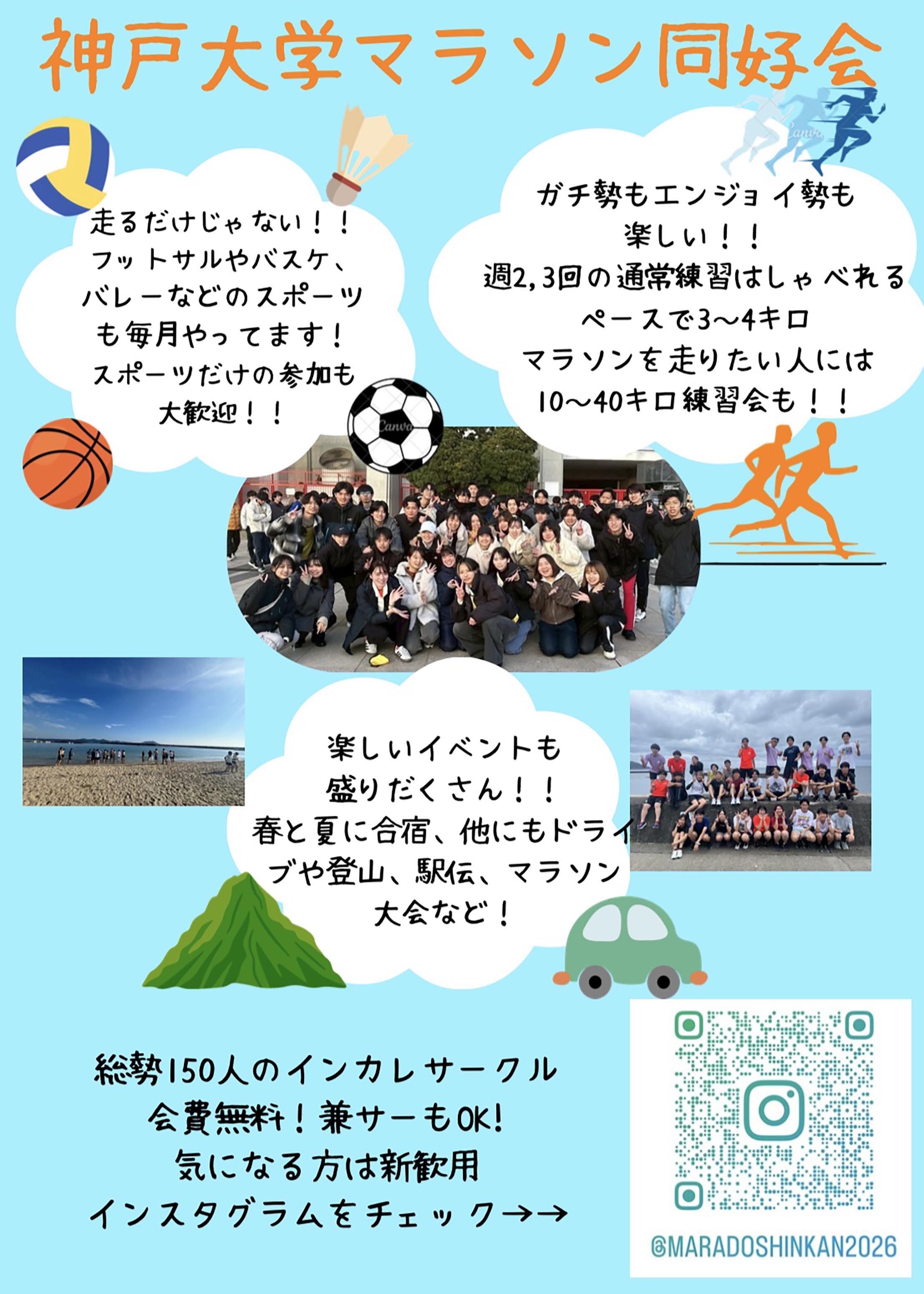 平日は阪急六甲付近でランニングしています!休日はスポーツイベント(フットサル、バスケ、バレー等)やランニングイベントを開催しています!毎年春と夏に合宿があったり、冬には他大学も参加する200人規模のマラソン大会を主催したりと楽しい活動が盛り沢山です!