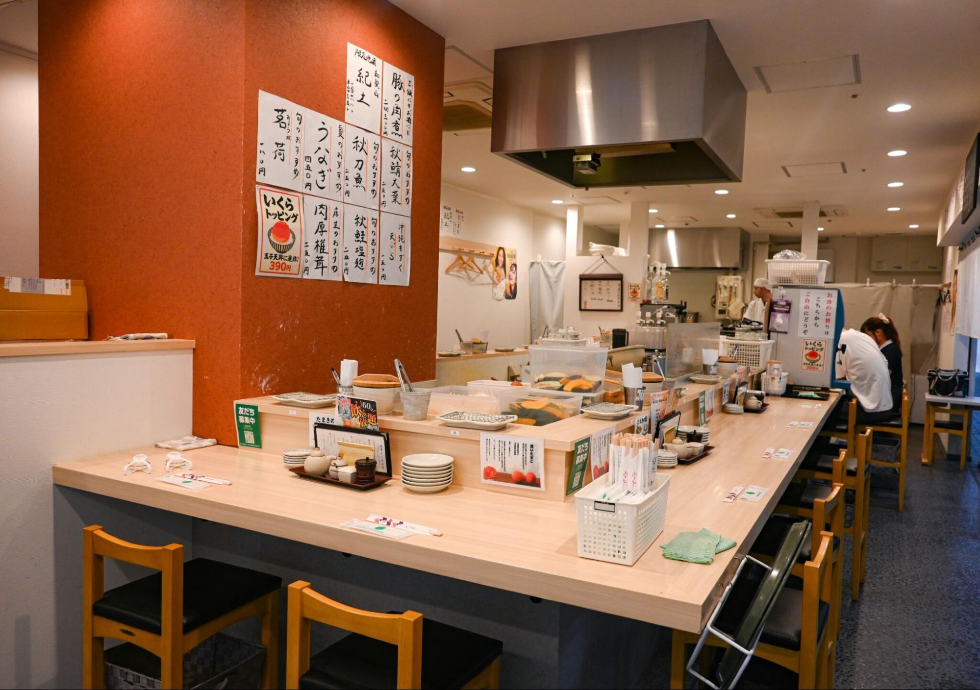 天ぷら屋さんというと敷居が高いイメージがありますが、店内が外から見えるオープンな造りで、気軽に立ち寄れる雰囲気になっています。