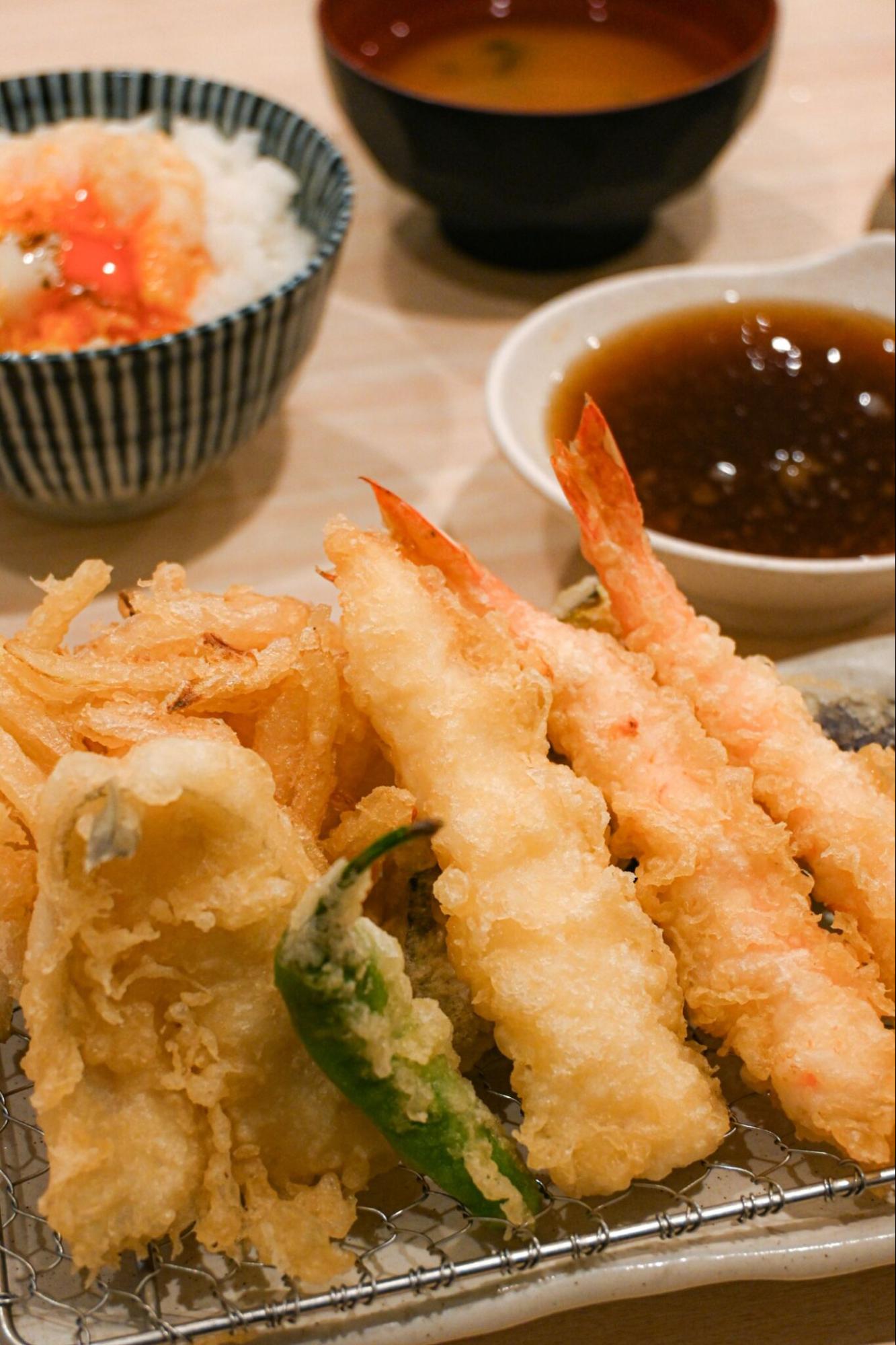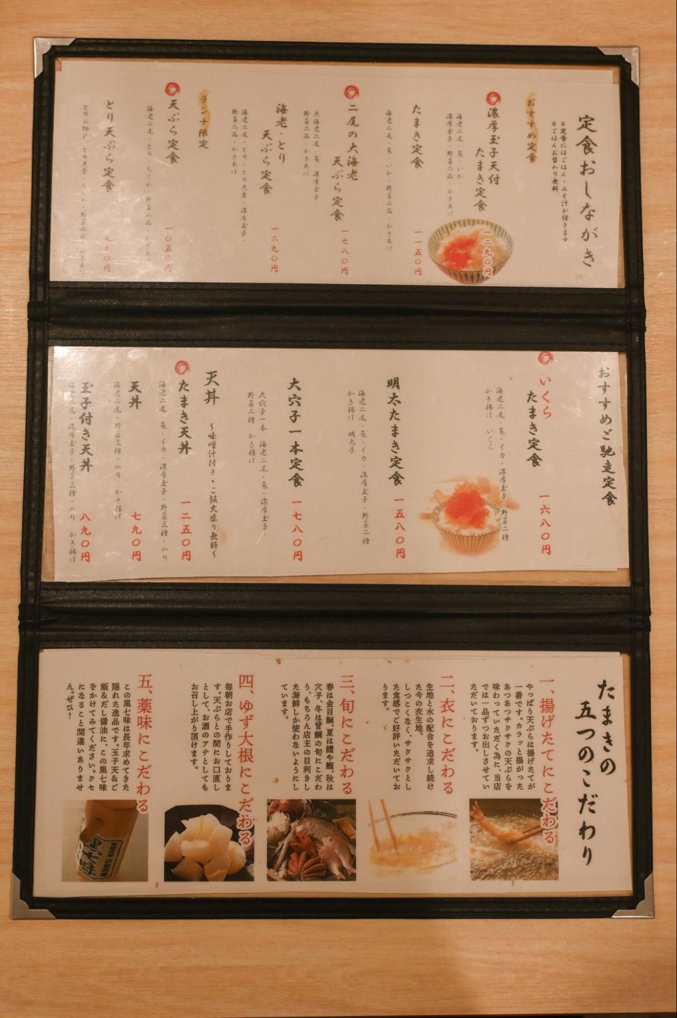 一番人気のメニューは「濃厚玉子天付たまき定食」(1,290円)。海老二尾、キス、イカ、野菜二品、かき揚げ、濃厚玉子天に加えて、白ご飯、お味噌汁が付いてきます。「お客さんにお腹いっぱい食べてほしい」という思いから、ご飯はおかわり無料!