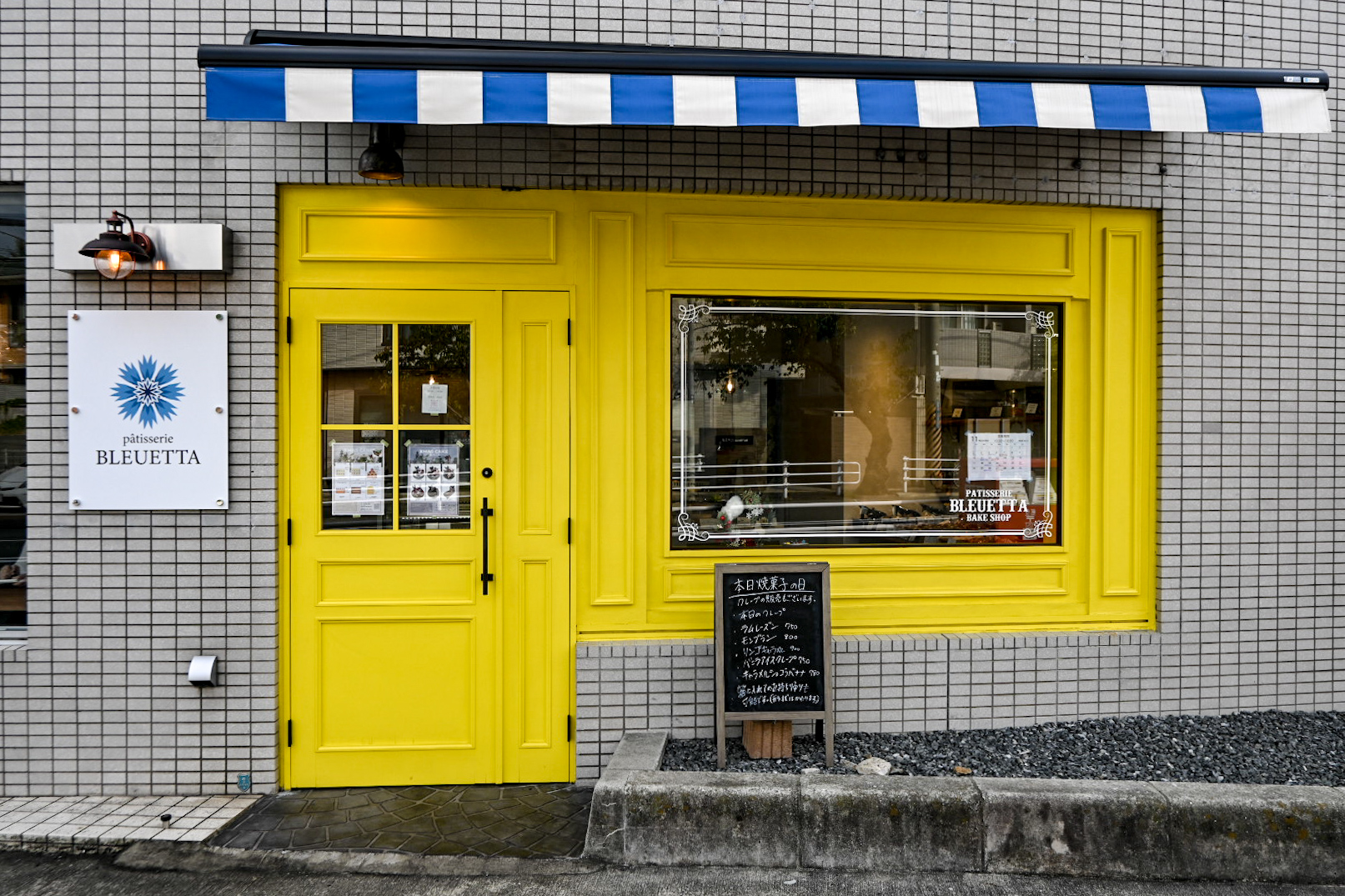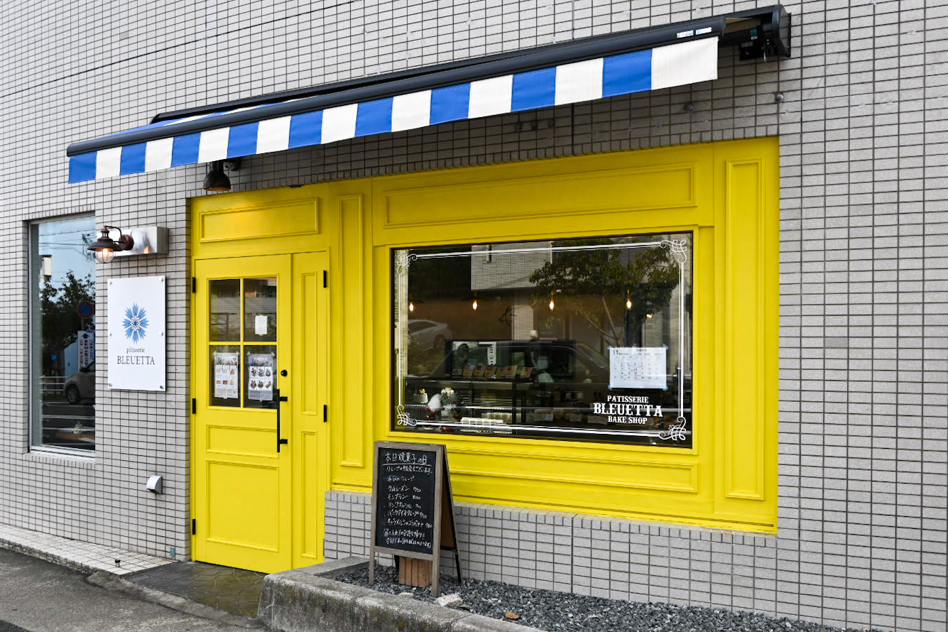 まるで絵本に出てくるような黄色いドアに青と白の屋根のお店、patisserie BLEUETTA。