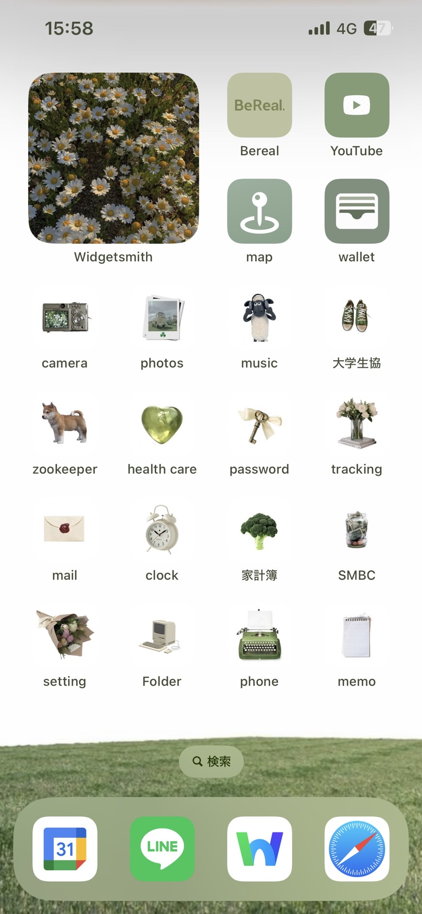 するとどうでしょう、このような純正のアプリアイコンとは全く印象の違うホーム画面にすることができます(センスの微妙さには触れないでいただきたい)。ちなみに、画面内にある写真のような大きめのアイコンは、「WidgetSmith」という無料アプリを使えば配置することができます。ただの飾りアイコンですが。