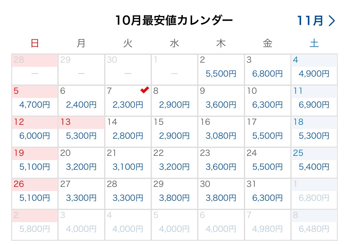 10月のカレンダーの火曜日・水曜日の欄を縦に見ると出発日が遠くなればなるほど値段が上がっていることがわかります。かといって、直近になりすぎると席が埋まってしまう可能性が高くなるため、安く、かつ確実に席を予約するための見極めが大切になります。